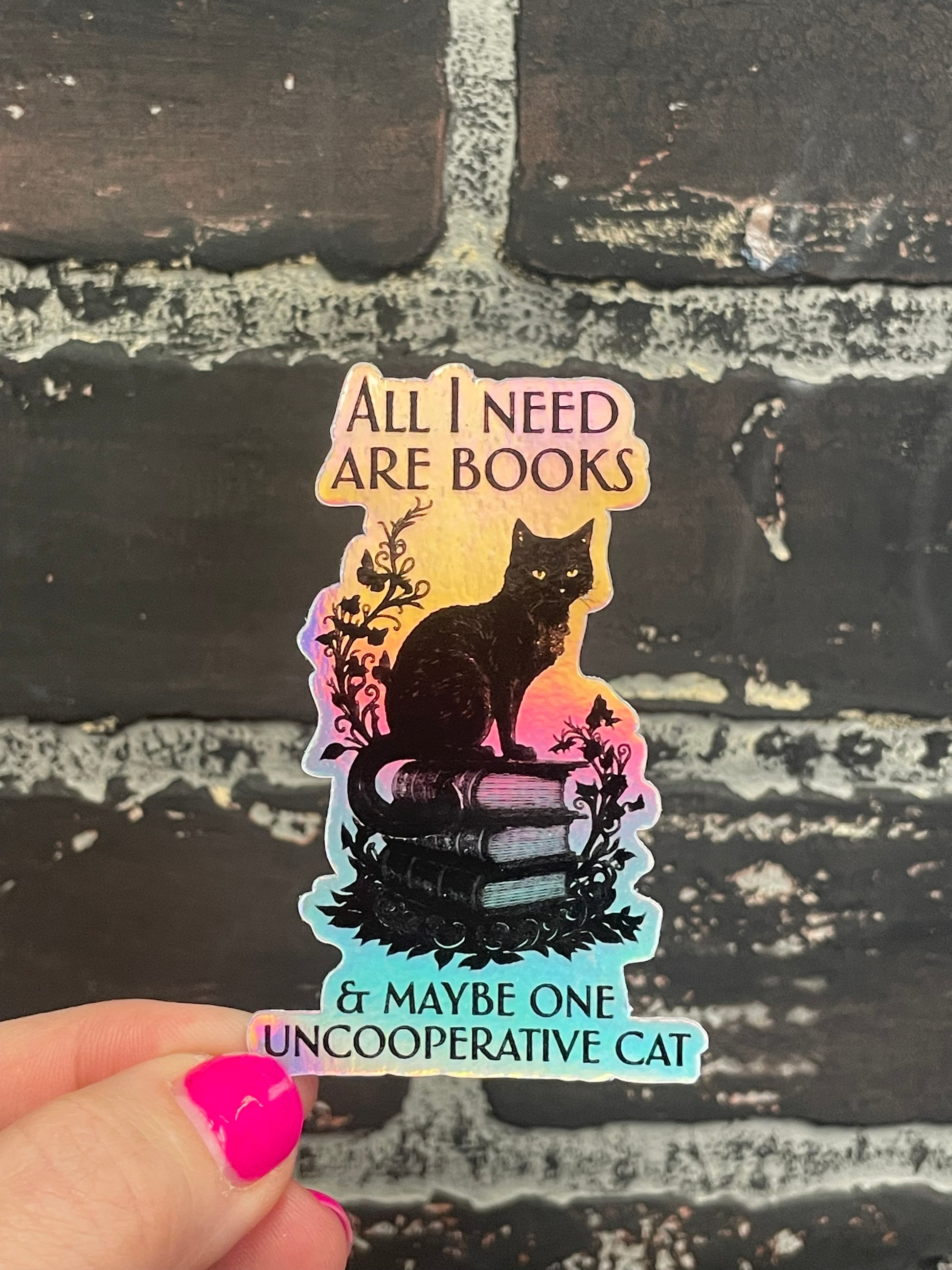 All I need are books & maybe one uncooperative cat, 3” Holographic Sticker