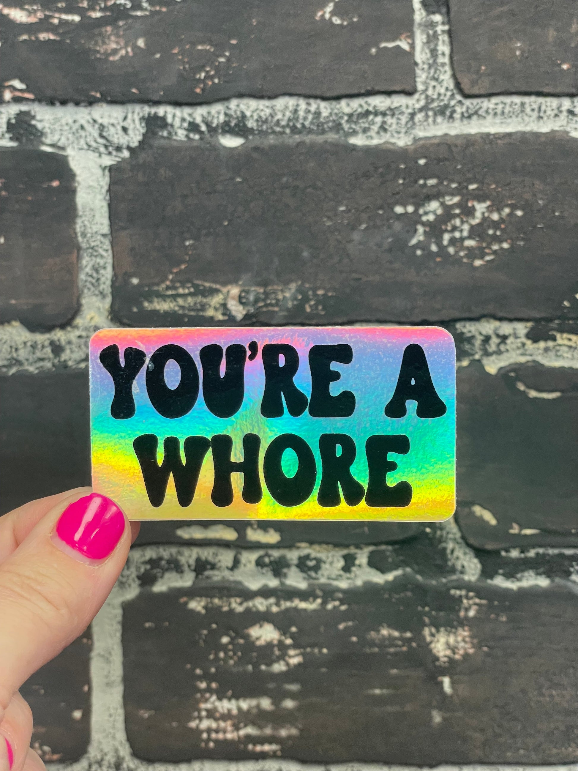 Make a bold statement with the You're a Whore 3” Holographic Sticker. Made from high gloss, laminated vinyl, this sticker is waterproof and scratch-proof, ensuring longevity.