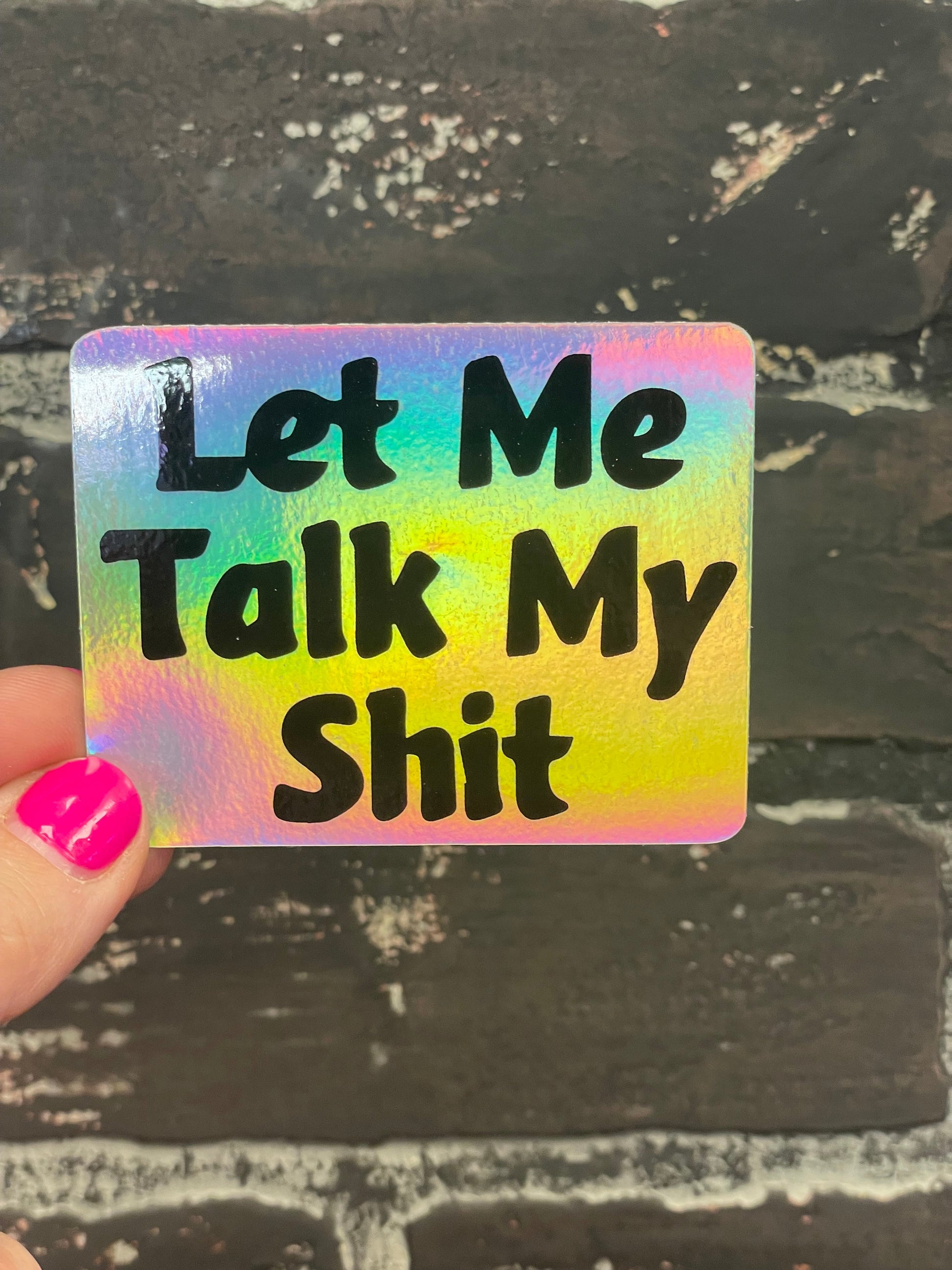 Make a statement with the Let me Talk my Shit 3” Holographic Sticker. Made from high gloss, laminated vinyl, this vibrant sticker is built to last, featuring waterproof, scratch-proof, and UV resistant qualities. Perfect for personalizing cars, water bottles, or any surface that craves an edge. Elevate your style and showcase your attitude—add this bold piece to your collection today!
