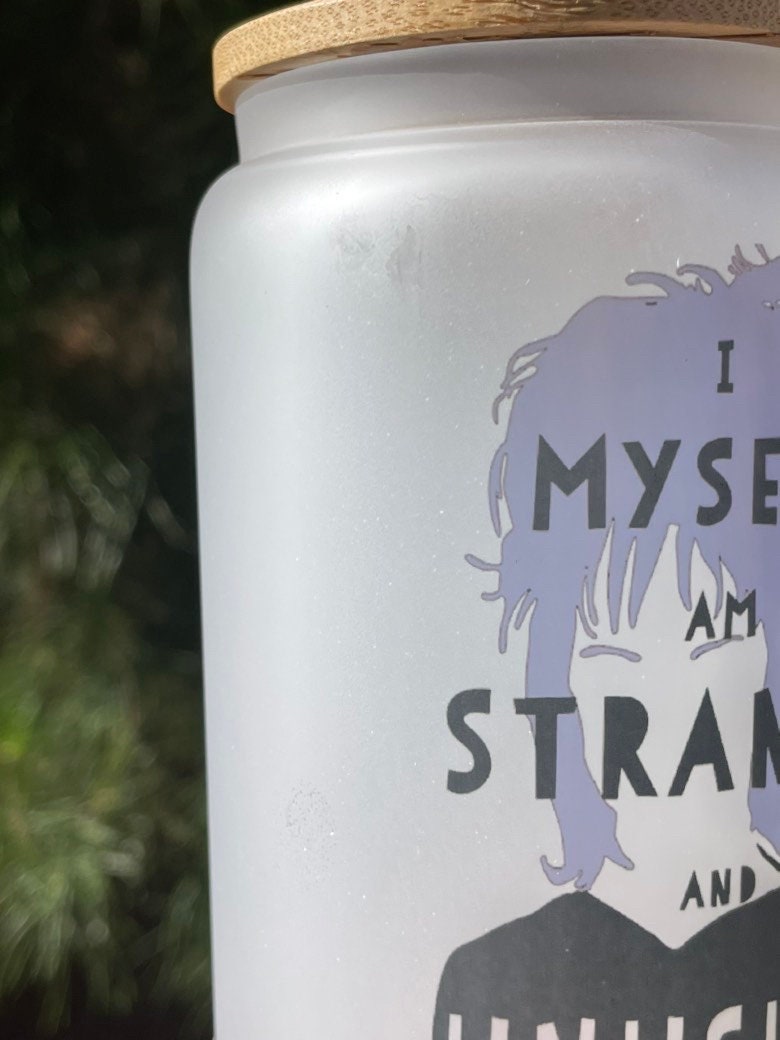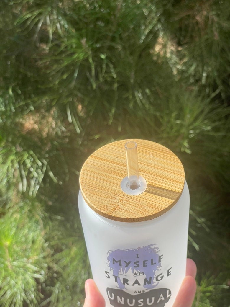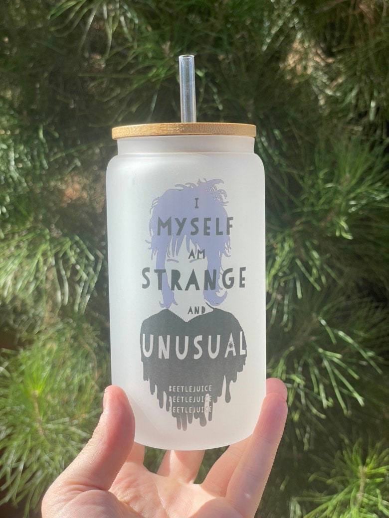 Introducing the Beetlejuice Strange & Unusual 16oz Frosted Glass Tumbler with Bamboo Lid. This striking tumbler combines style and functionality, featuring a whimsical design that elevates your drink experience.