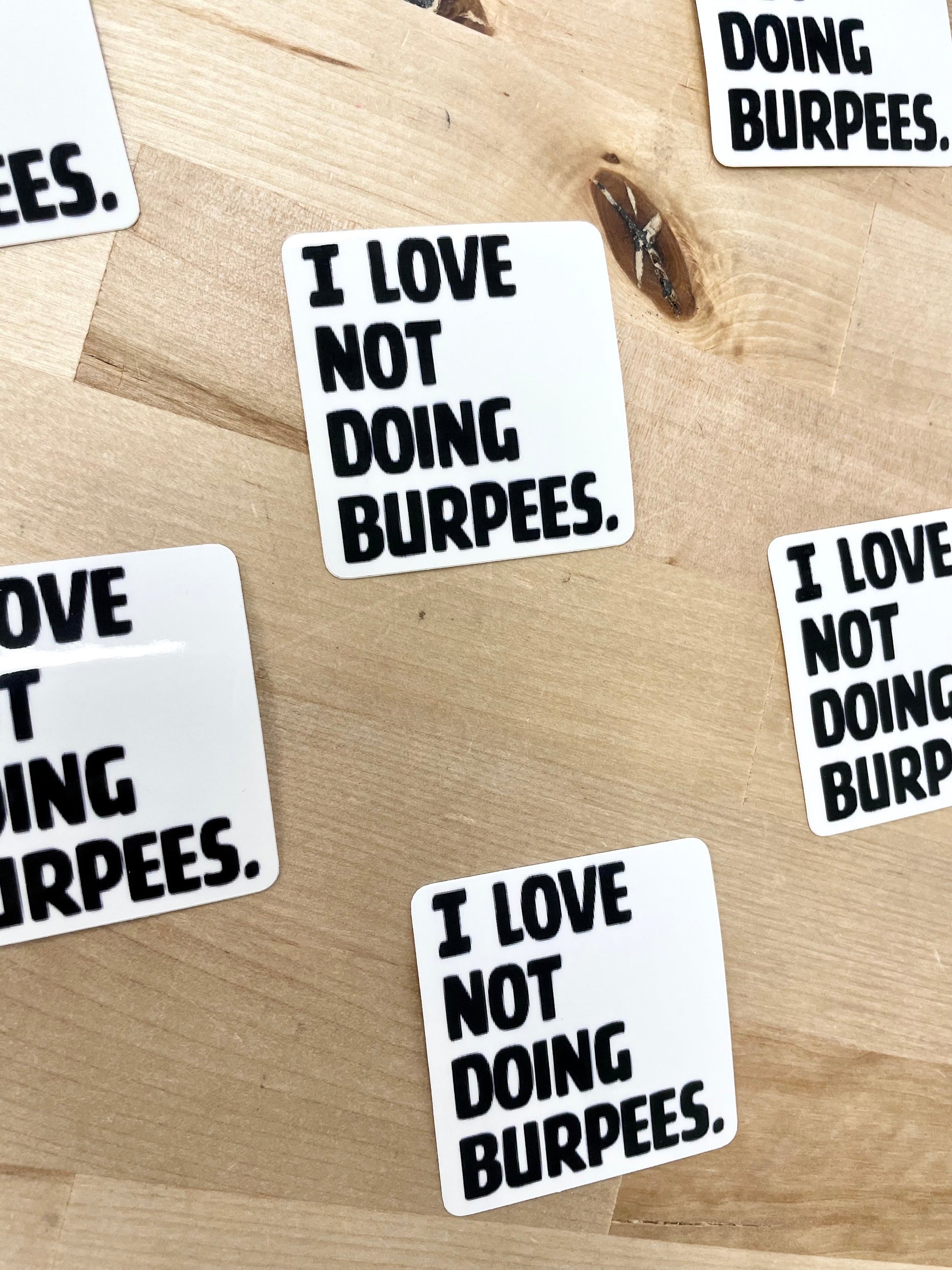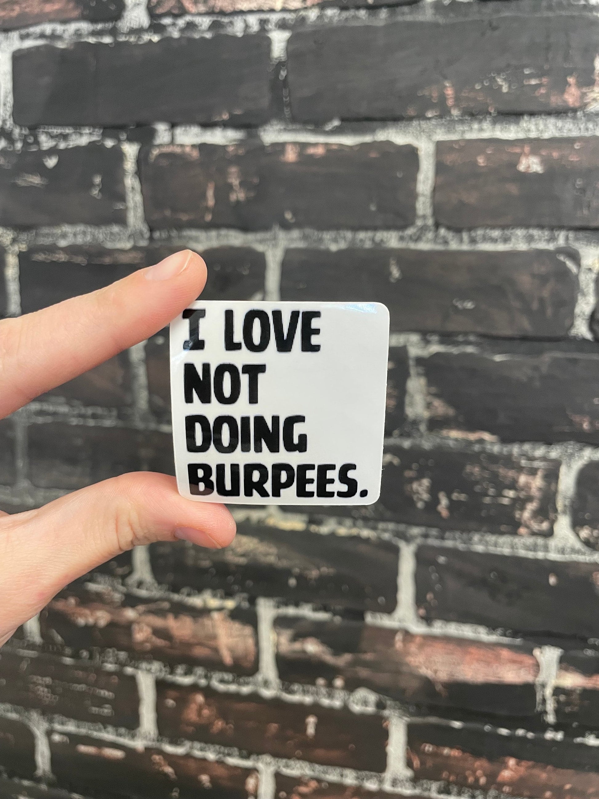 Celebrate your love for leisure with the I Love Not Doing Burpees 2” Sticker. This high gloss, laminated vinyl sticker combines humor and personality, built to withstand the outdoors with its durable design. Featuring UV protection, it resists fading, keeping your message vibrant over time. Perfect for car bumpers, water bottles, or anywhere you want to showcase your playful attitude towards workouts. Embrace life’s lighter moments and add this cheeky sticker to your collection today!