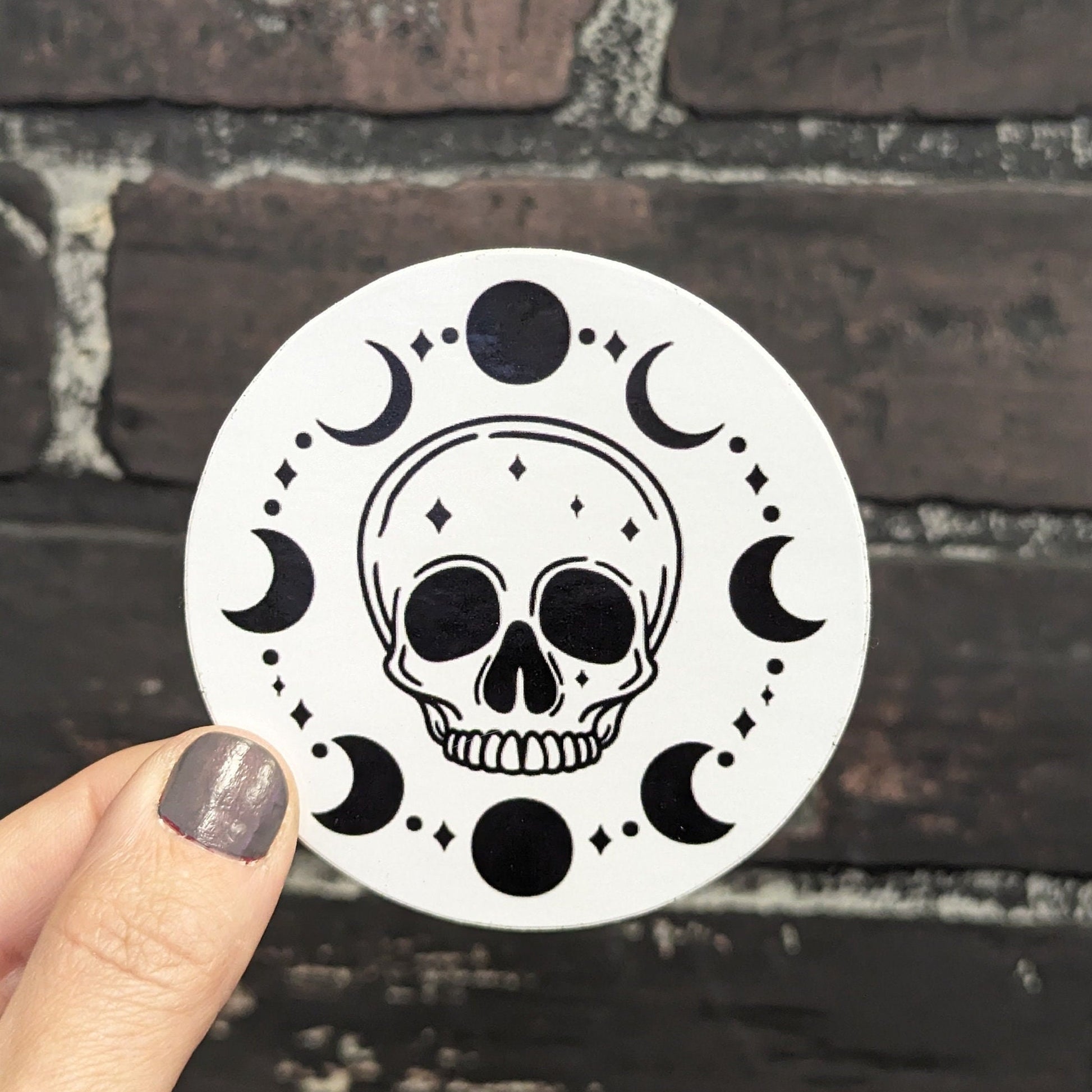Elevate your style with the Skull Moon Phases 3” Sticker from ThreeBlackCats. This eye-catching design, crafted from high gloss, laminated vinyl, is built to last.