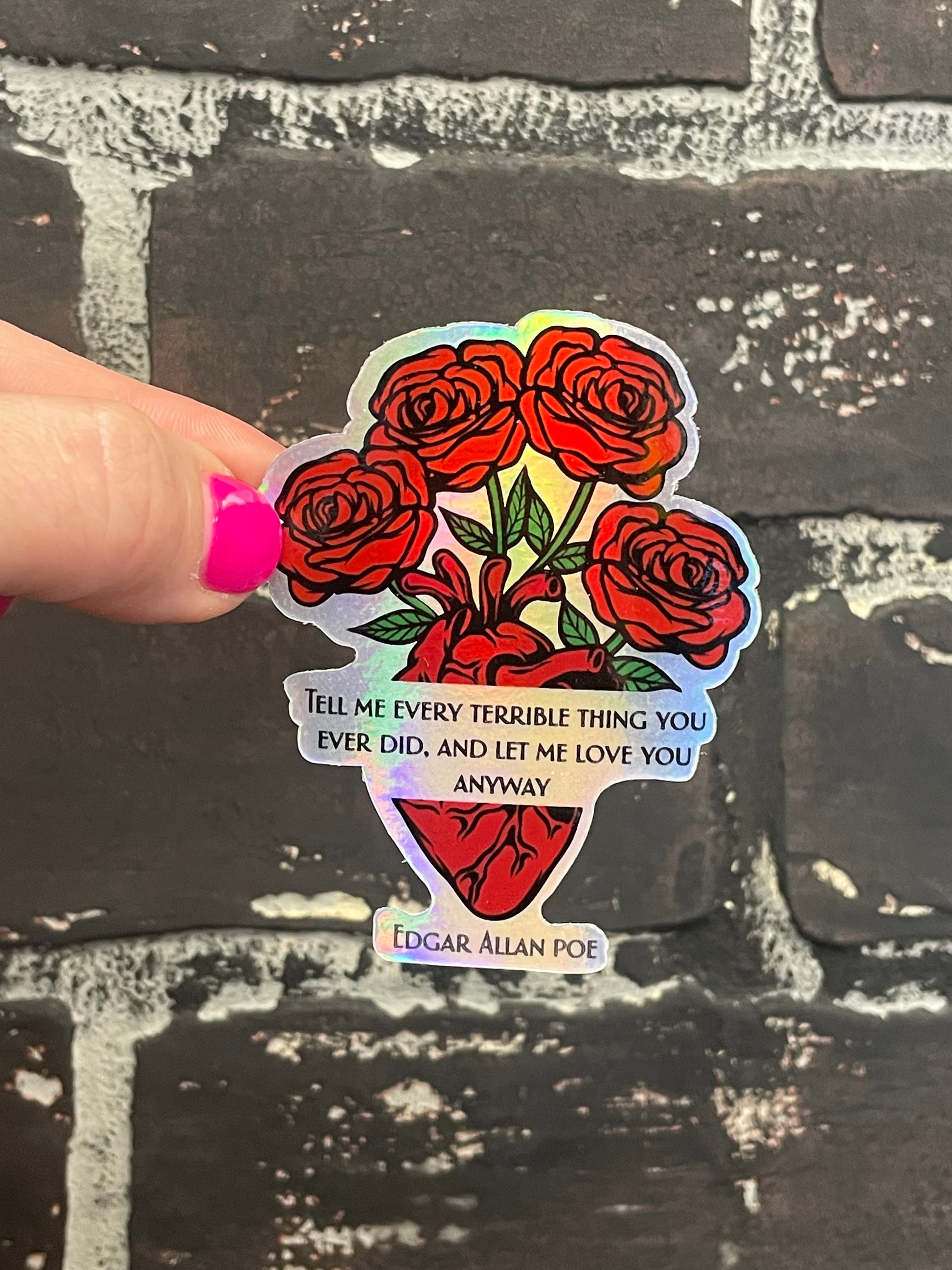 Tell me every terrible thing you ever did, and let me love you anyway, Edgar Allen Poe, 3” Holographic Sticker