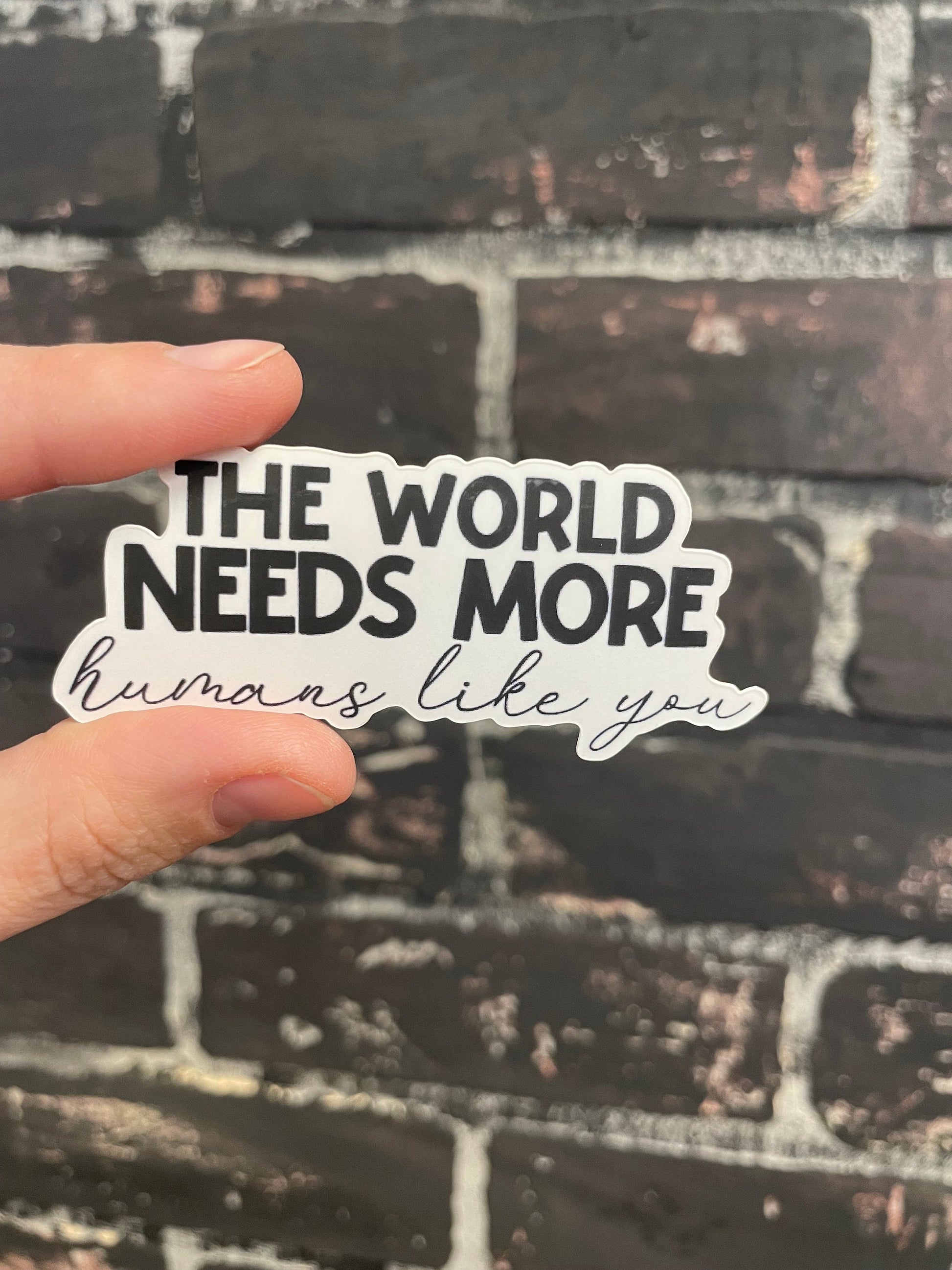 Elevate your space and spread positivity with the 3" Sticker proclaiming "The world needs more humans like you." Made from high gloss, laminated vinyl, this sticker is waterproof, scratch-proof, and UV resistant, ensuring vibrant colors that last. Perfect for personalizing cars, water bottles, notebooks, and more, it’s an ideal way to express your individuality and inspire those around you. Make a statement that resonates and radiates good vibes everywhere you go!